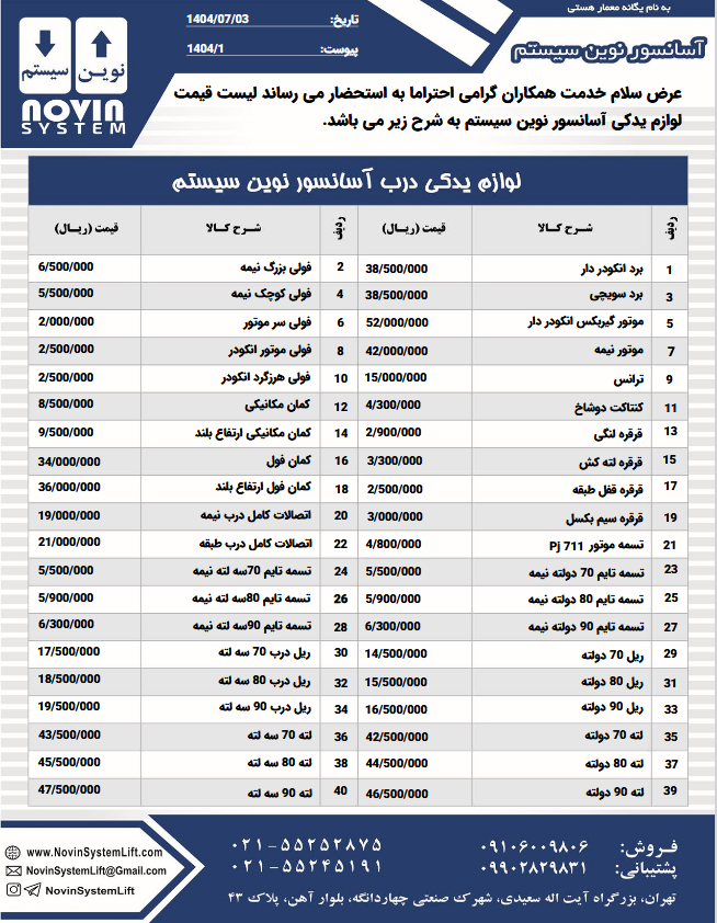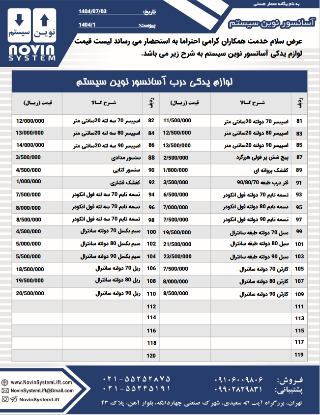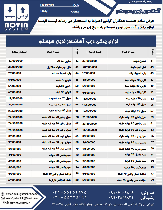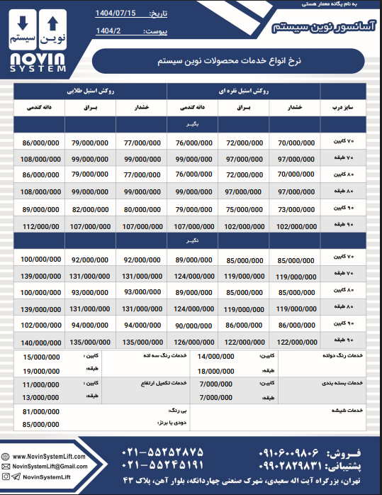 لیست قیمت درب آسانسور نوین سیستم نرخ انواع خدمات محصولات نوین سیستم لیست قیمت لوازم یدکی آسانسور نوین سیستم